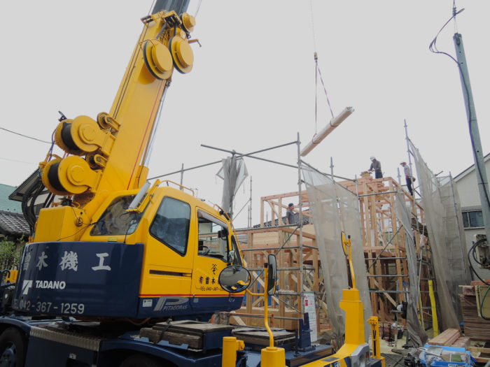クレーン車がうなりをあげて資材を釣り上げて設置していくたびに「家」が現れてきます。自ずと気分が高揚します。なぜ昔から上棟式が行われているのか見ていればわかる気がします。一種のお祭りごとのような気分の高まりを前に、祝い事としてまた工事の安全を願って宴席を設けたくなる。実に自然な感情からくるものなのだろうと思えてきます。