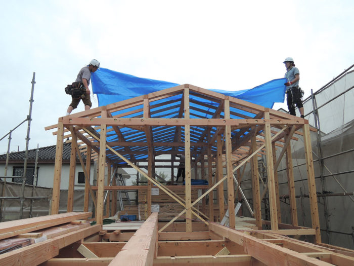 さて、事前に木材加工工場で接合部を加工した材を組み上げていきます。特殊な組み方はないので早いものです。この住宅では6時間ほどで組みあがりました。翌日の雨に備えてブルーシートで養生して、この日の作業を終えました。毎回思いますが、鳶の皆さんはどうして梁の上を平気で歩き回れるんでしょう・・・。画像左手がこの住宅を手掛けてくれる棟梁です。ひょいひょいと事も無げに歩き回り、組み上げてくださいました。