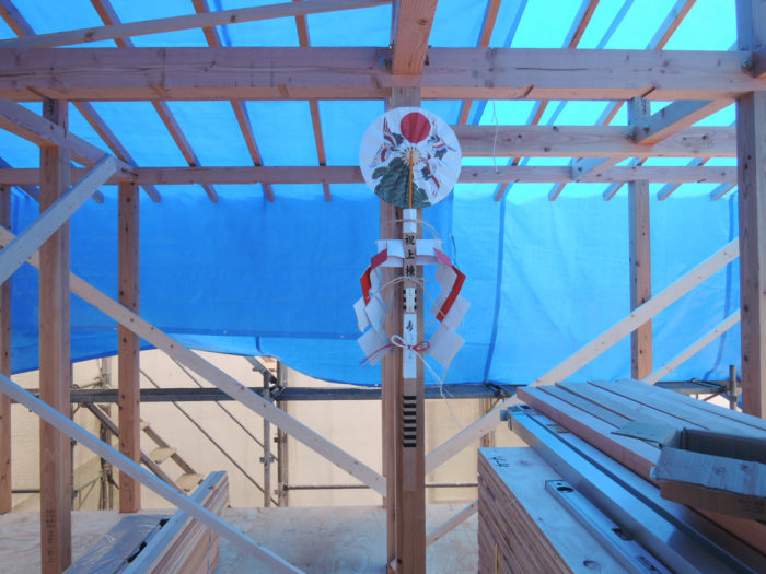 前日は雨で、翌日も雨予報という中で、なんとか雨をさけて上棟できました。
